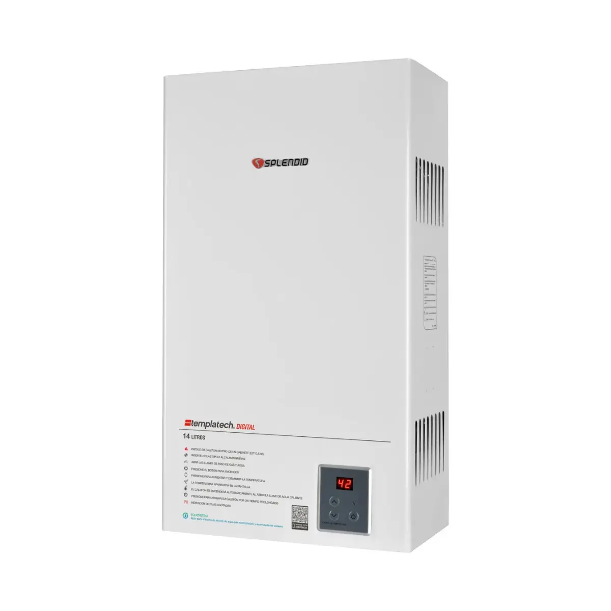 El calefón Splendid Templatech ofrece agua caliente ilimitada para duchas, lavamanos, lavaplatos y más, con la comodidad de un encendido automático ionizado. Basta con abrir la llave del agua caliente para que el equipo se active, sin necesidad de fósforos, chisperos ni llama piloto permanente. Esto se traduce en un ahorro significativo de gas y mayor seguridad en el hogar.