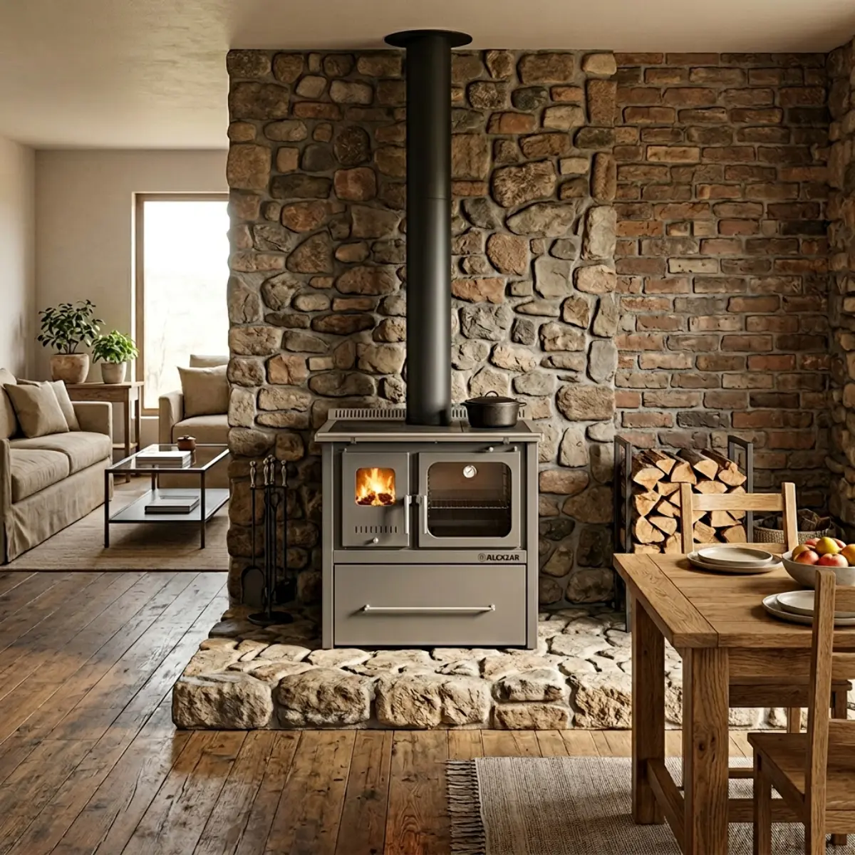 Modelo M – Línea Europea de Alcazar Tradición, innovación y seguridad en tu cocina Descubre el Modelo M de la línea Europea, una cocina a leña a combustión lenta que combina eficiencia, diseño y calidez. Disponible en modelos con capacidades y dimensiones variadas diseñadas para brindar el mejor rendimiento en cocción y calefacción. Su clásico diseño moderno y práctico, inspirado en la calidez del sur de Chile, combina eficiencia energética con una estética sofisticada. Los modelos M70, M80 y M90 cuentan con una cubierta de acero y cristales termocerámicos capaces de resistir temperaturas de hasta 800° C Para una experiencia segura y práctica, el Modelo M contiene: Manillas y horno de acero inoxidable, resistentes y duraderos. Cajón con rieles multipropósito, ideal para almacenamiento versátil. Termómetro de alta precisión, para un control exacto de la temperatura. Rieles de seguridad en el horno, evitando que las bandejas o rejillas se deslicen accidentalmente, reduciendo el riesgo de quemaduras. Diseñada con la esencia del sur de Chile, cada cocina Alcazar refleja calidad y tradición en cada detalle. INFORMACIÓN TÉCNICA Alto: 91 cm Ancho: 73,5 cm Profundidad: 56,5 cm Capacidad del horno: 43 L Peso: 118 kg Potencia: 9 KW = 7,738 Kcal Rango Calefacción: Hasta 140 m² Tiraje: Frontal Diámetro del cañón: 5" Garantía mínima legal: 6 meses.
