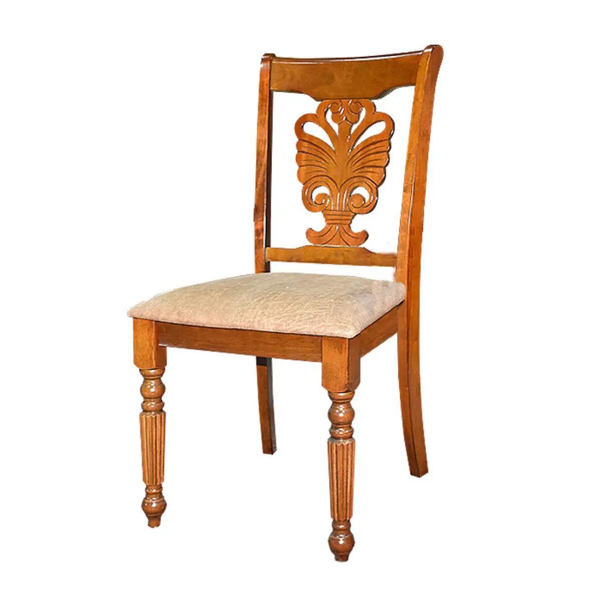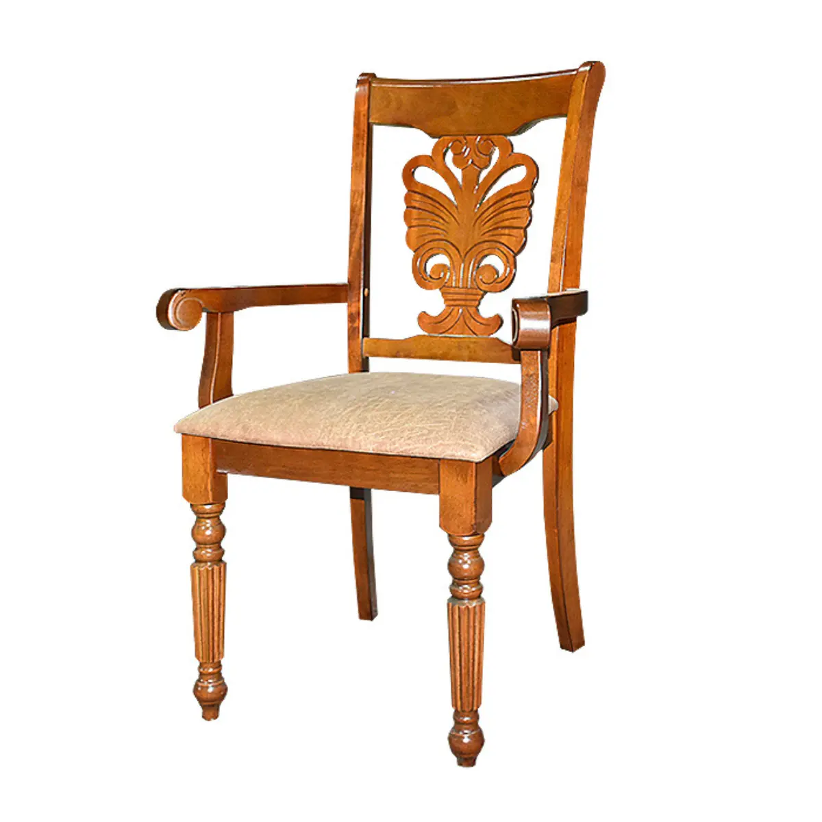 Sillas y sitiales estilo Reina Ana: Tanto los sitiales como las sillas poseen patas frontales torneadas y estriadas, además de un respaldo estilo Reina Ana con pala tallada central. Los apoyabrazos en los sitiales brindan confort y distinción al usuario, ya sea el dueño de casa o el invitado de honor.