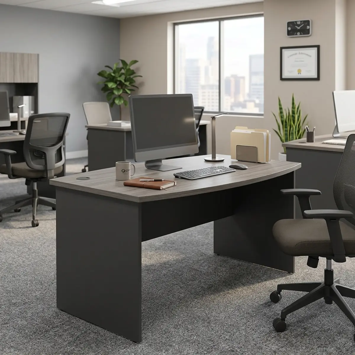 Forma curva ergonómica: La forma curva del escritorio te permite abarcar más espacio de trabajo sin tener que estirarte, mejorando la postura y la productividad. Ideal para usuarios que requieren múltiples monitores, documentos a la vista o equipos adicionales.