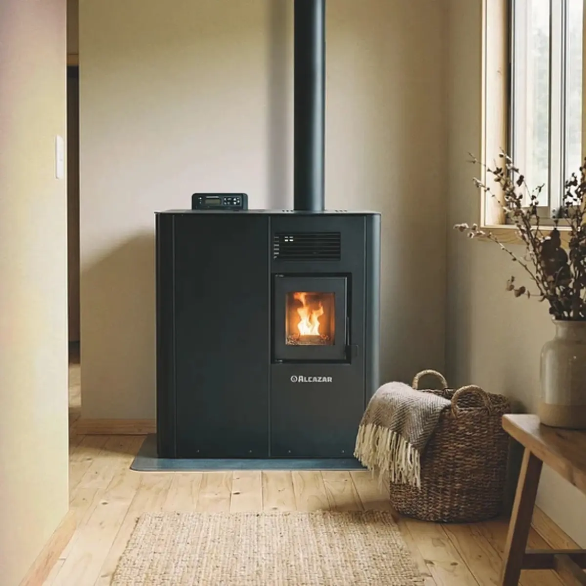 Máximo confort sin ocupar mayor espacio en tu hogar Estufa a Pellet Puelo de la Línea Austral de Alcazar es la solución definitiva para quienes buscan potencia en un formato compacto. Este modelo redefine la eficiencia, permitiendo disfrutar de un calor envolvente en todo tu hogar adaptándose a tu ritmo de vida Su diseño Slim moderno y funcional se adapta perfectamente a diferentes espacios, brindando calidez y ahorro energético en cada uso a través de tecnología de combustión limpia Con el fin de enriquecer su experiencia, el modelo Puelo contiene: Panel digital y control remoto, para una operación más cómoda. Funcionamiento automático programable, para mayor eficiencia. Control vía WiFi, permitiendo ajustar la temperatura desde cualquier lugar. Tolva de 7 kg, brindando hasta 9 horas de autonomía. Vidrio termocerámico resistente a 800° C, máxima seguridad. Consumo eficiente de pellet, con un rango de 0.56 a 1.2 kg/h. Bajo consumo eléctrico, garantizando ahorro y sostenibilidad. Cuenta con Mantenimiento Sencillo: Incluye baquetas de limpieza integradas para asegurar que tu equipo funcione siempre al 100% Fabricada con los más altos estándares de calidad, Puelo refleja la experiencia y tradición del sur de Chile, garantizando un producto resistente, eficiente y pensado para el bienestar de tu hogar. INFORMACIÓN TÉCNICA Alto: 70,5 cm Ancho: 65 cm Profundidad: 24 cm Peso: 48 kg Diámetro del cañón: 3" Potencia nominal: 5,4 kW = 4643 Kcal Eficiencia: 86 % ( Clase A) Rango de calefacción: Hasta 90 m² Capacidad de tolva: 7 kg Consumo eléctrico: 220V - 50Hz / 310W - 50W Régimen Encendido: 45 – 280 W/h Garantía mínima legal: 6 meses.