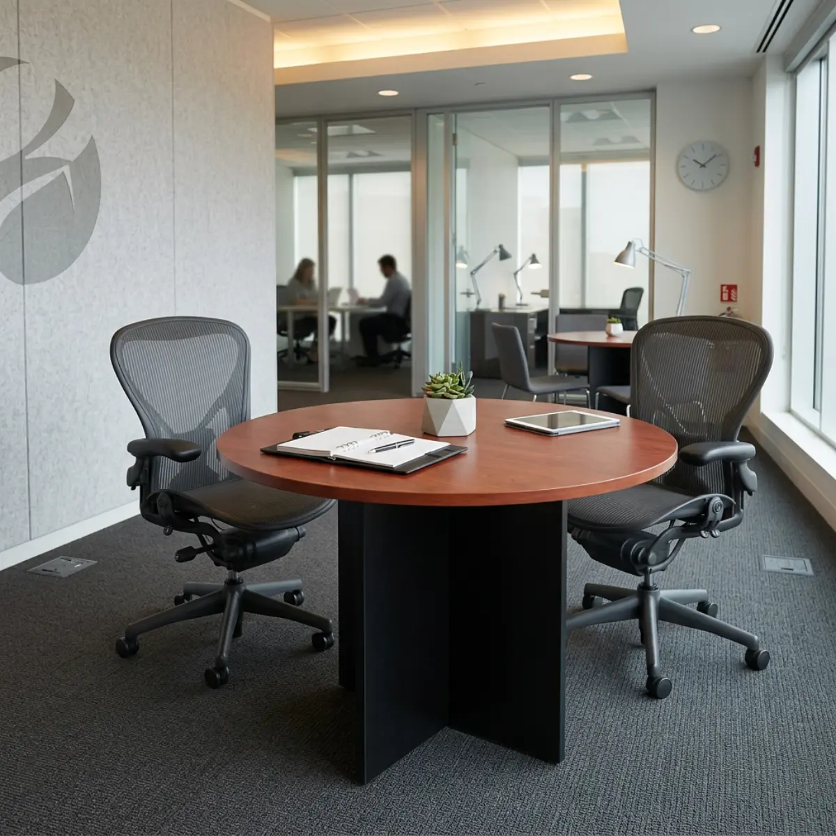 Diseño circular sin esquinas: Las mesas redondas son ideales para reuniones de equipo: facilitan la comunicación, evitan jerarquías visuales y permiten que cada participante acceda fácilmente a su lugar. Además, optimizan el flujo de paso en oficinas pequeñas o medianas.