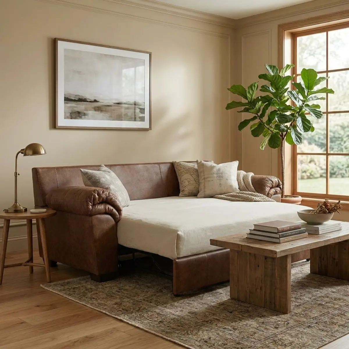 Función Sofá Cama – Espacio para invitados: Su práctico sistema pull-out transforma el sofá en una cama tamaño Full, ideal para alojar invitados durante la noche. Incorpora un colchón de espuma viscoelástica de doble pliegue asentado sobre un marco metálico de soporte resistente, garantizando un descanso confortable.
